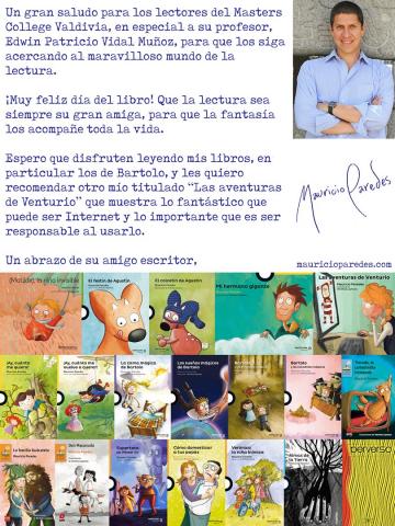Para comenzar, recibimos saludos de tres escritores chilenos: en primer lugar Rosabetty Muñoz, destacada poeta chilota ganadora del premio Altazor 2009; Elicura Chihuailaf, escritor mapuche ganador del premio nacional de literatura en el año 2020; Carla Christie, científica y escritora del libro “el delfín chileno”. Por otra parte, también nos envió sus saludos el gran Mauricio Paredes, autor de la saga Bartolo que año a año leen los estudiantes de diferentes cursos del colegio.